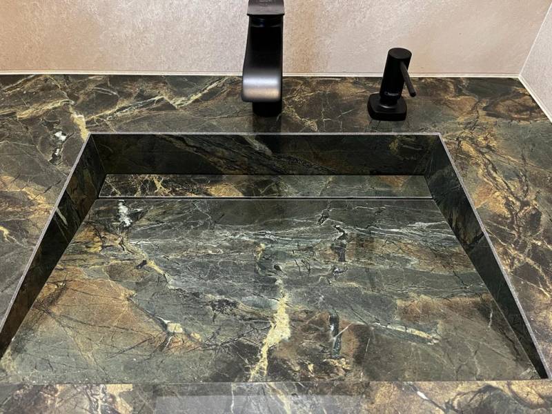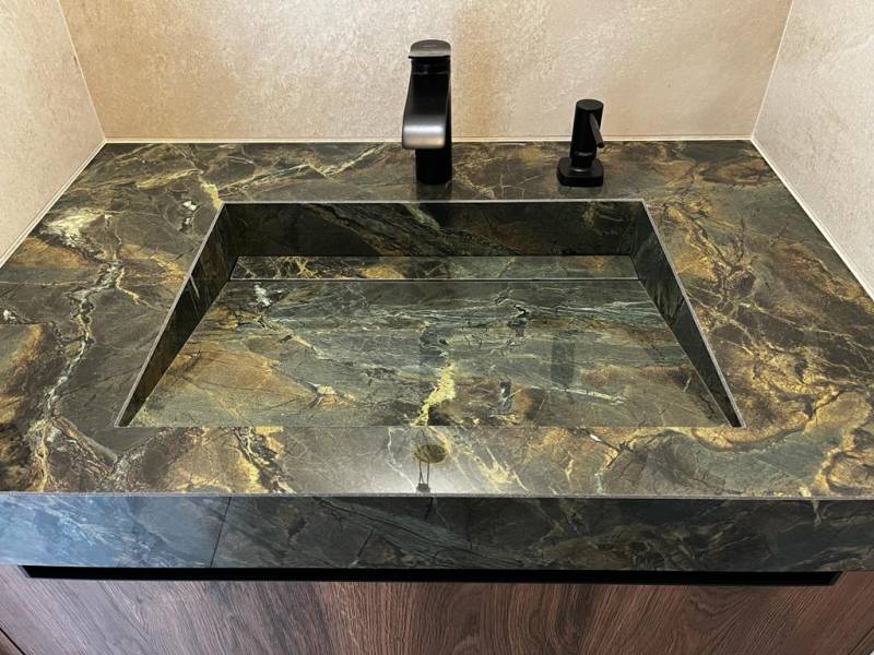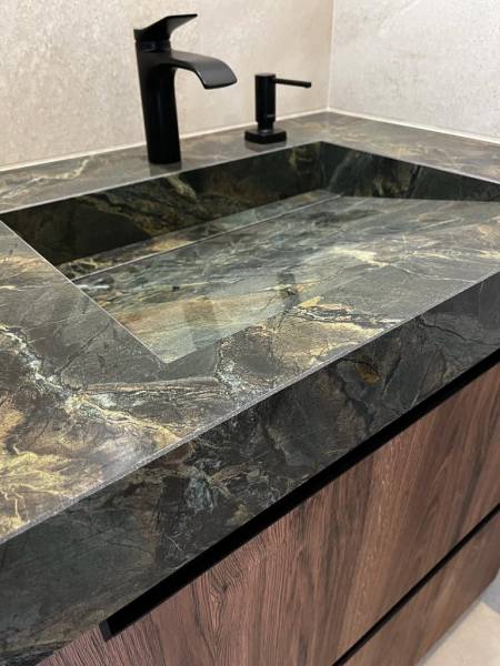 La céramique Verde Borgogna est un matériau unique, qui se distingue par sa teinte riche et profonde de vert émeraude, parsemée de veines nuancé de dorées. Son aspect vibrant et luxueux rappelle le marbre tout en offrant une texture lisse et élégante, idéale pour ajouter une touche de raffinement à tout intérieur. Grâce à son design, la céramique Verde Borgogna est parfaite pour des applications variées telles que les plans de travail, salles de bain ou encore des éléments décoratifs.