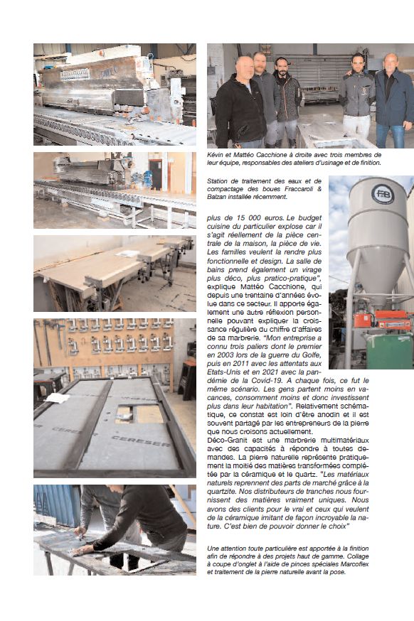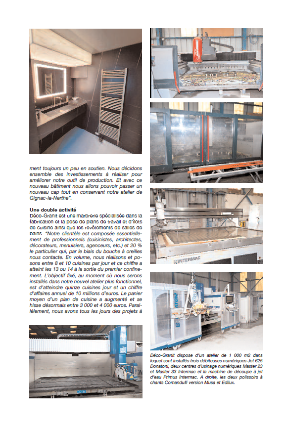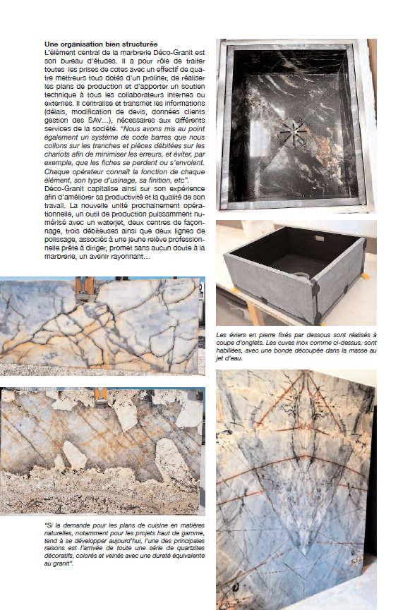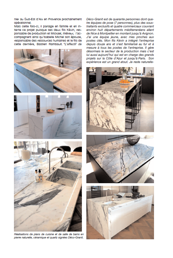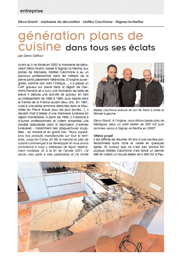 L'entreprise Déco Granit a été récemment mise en avant dans le journal PierreActual. Cet article met en lumière l'expertise de l'entreprise dans la marbrerie décorative, en particulier dans la création d'éléments en pierre naturelle et en céramique. Déco Granit se distingue par son savoir-faire haut de gamme et sa capacité à transformer les espaces en véritables œuvres d'art. Que ce soit pour des plans de travail, des cheminées, des salles de bains ou des crédences, chaque projet est réalisé sur mesure, en fonction des besoins et des goûts de chaque client.