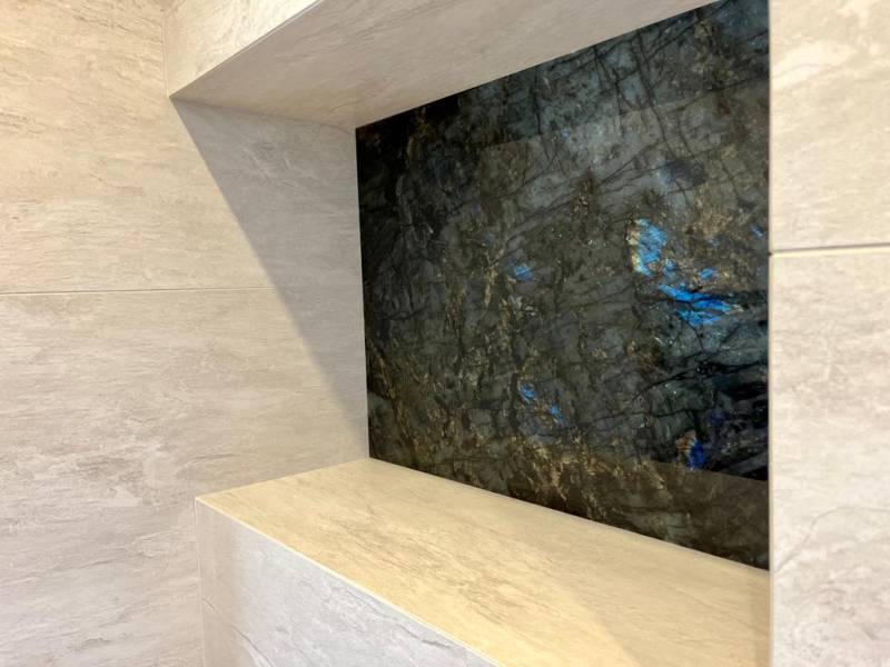 La niche de douche complète harmonieusement l’ensemble, créant un espace fonctionnel et raffiné. Résistante à l'humidité et aux variations de température, elle garantit une durabilité exceptionnelle tout en ajoutant une touche de modernité à votre douche. Le quartzite Labradorite est non seulement esthétique mais aussi très solide, ce qui en fait un choix idéal pour une salle de bain élégante et durable. Optez pour cette combinaison de matériaux uniques pour créer une salle de bain moderne, luxueuse et pleine de caractère.