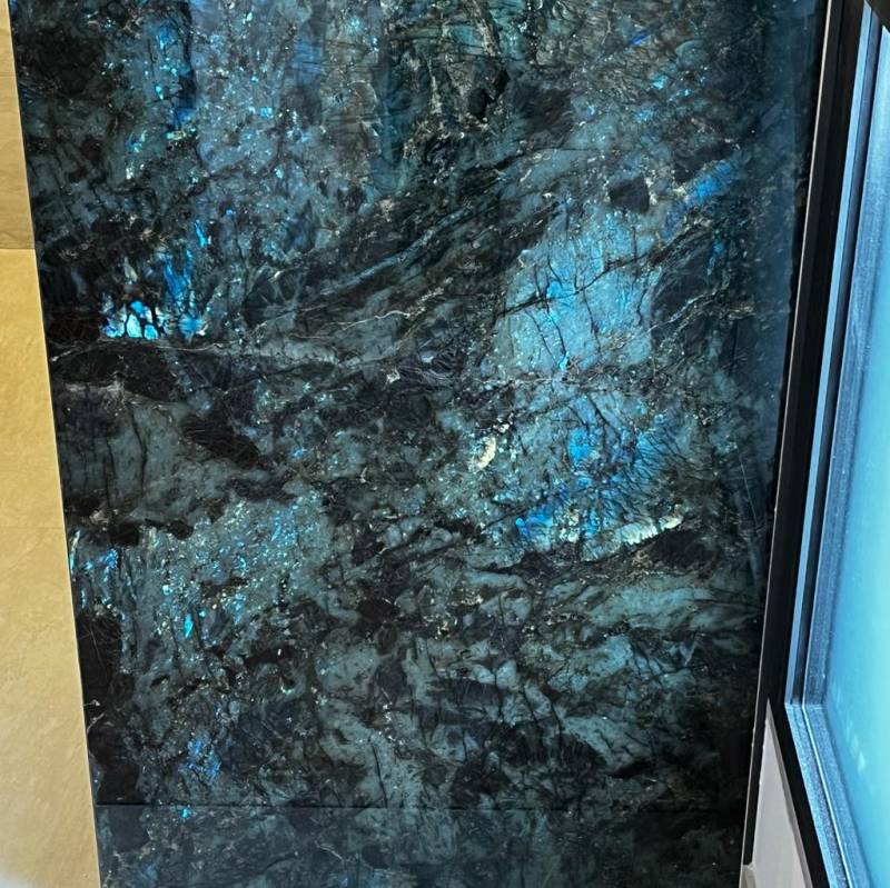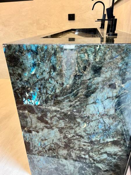 Transformez votre salle de bain avec le plan vasque et la niche de douche en quartzite Labradorite, un matériau qui allie beauté naturelle et performance. Cette quartzite, avec ses teintes profondes de bleu, vert et argent, crée une ambiance luxueuse et moderne. Son aspect minéral, rehaussé de subtiles variations de couleurs, apporte une dimension innovante à votre espace. Le plan vasque en Labradorite offre une surface élégante et pratique, résistante aux éclaboussures et facile à entretenir, pour un usage quotidien sans compromis sur l'esthétique.