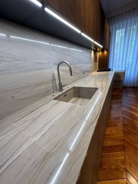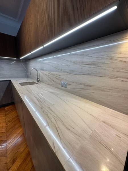 Que ce soit pour un plan de travail ou d'autre éléments décoratifs, ce quartzite beige transforme chaque espace avec un charme et une fonctionnalité optimale. Choisir cette quartzite, c’est opter pour une solution élégante et durable, alliant performance et esthétique dans votre cuisine.