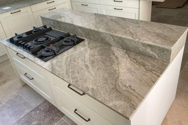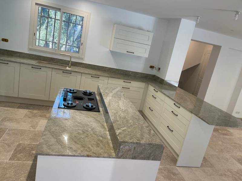 La Quartzite Madrepola est une pierre naturelle d'une élégance rare, qui se caractérise par ses couleurs subtiles allant du blanc crème au beige, parsemées de veines grises qui lui confèrent une texture élégante. L'aspect légèrement nacré de la pierre permet de jouer avec la lumière et crée un effet visuel, offrant ainsi une profondeur à chaque espace. la Quartzite est une pierre extrêmement durable, résistante aux rayures, aux taches et à l'humidité, ce qui en fait un choix idéal pour des surfaces comme les plans de travail, les salles de bain, ainsi que pour d'autres éléments décoratifs.